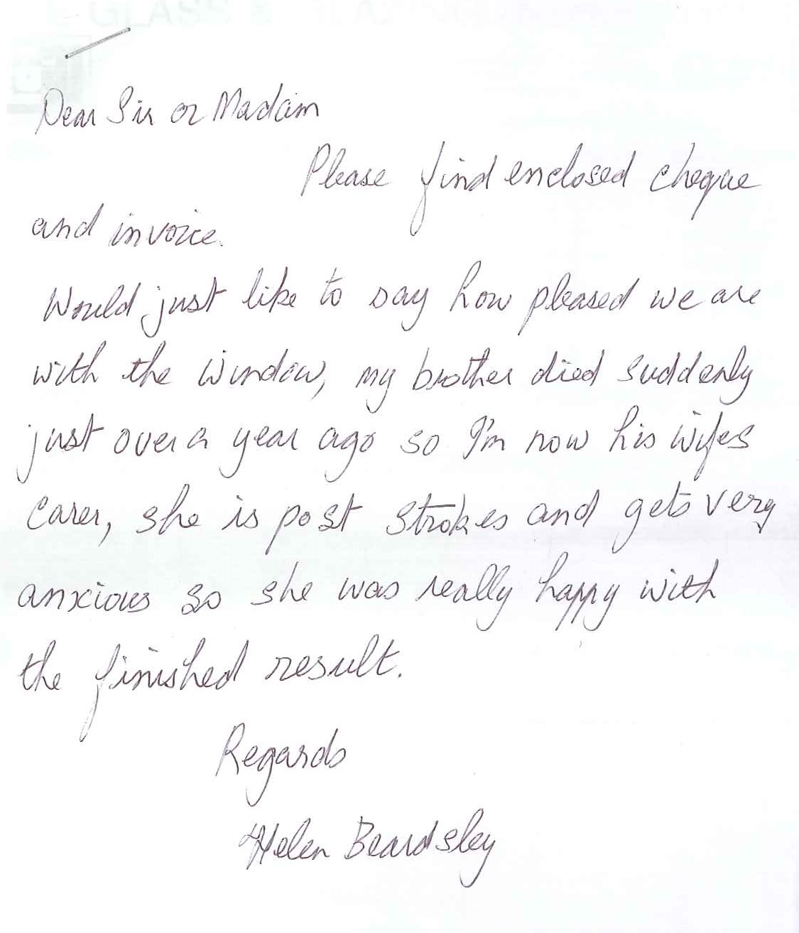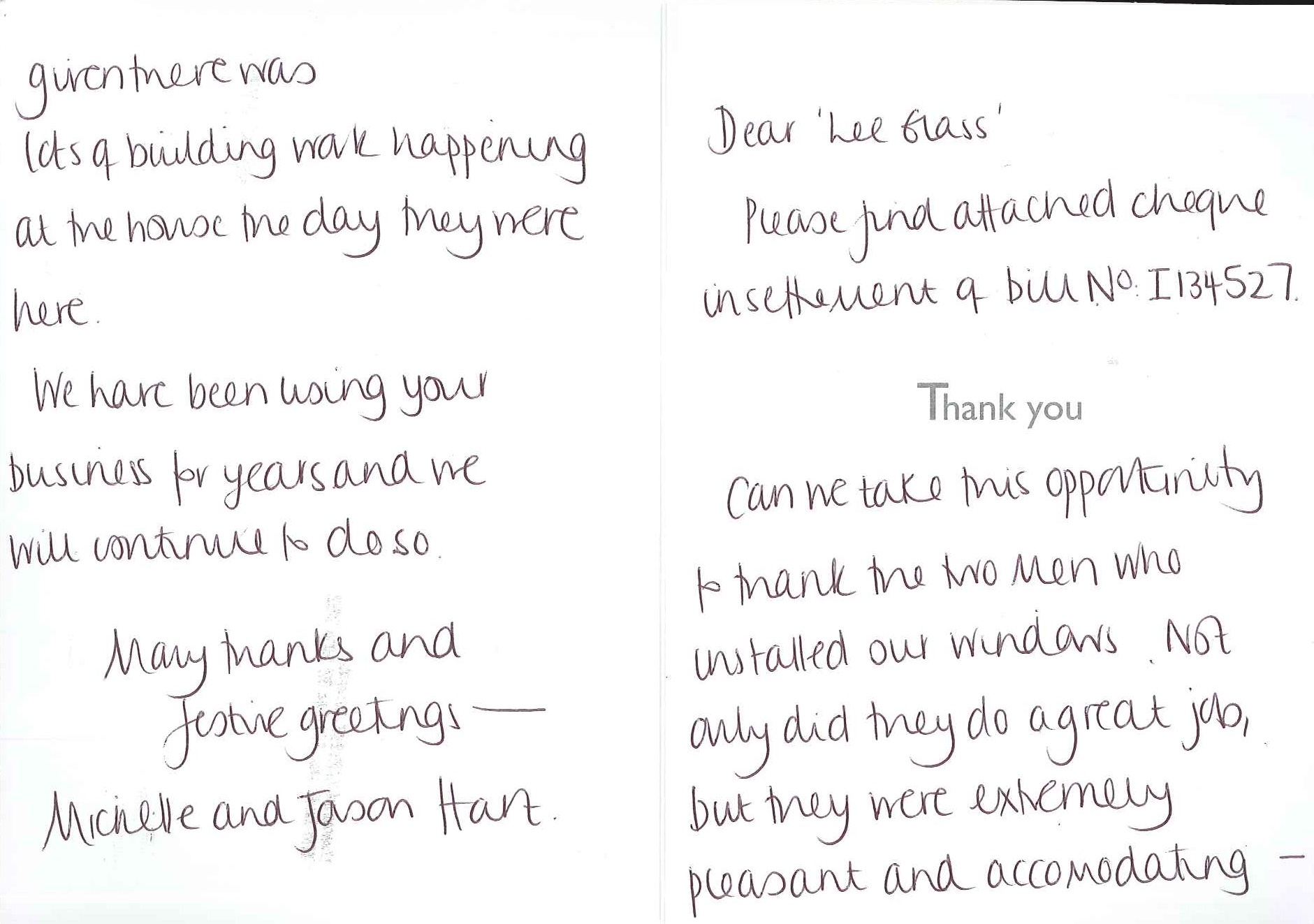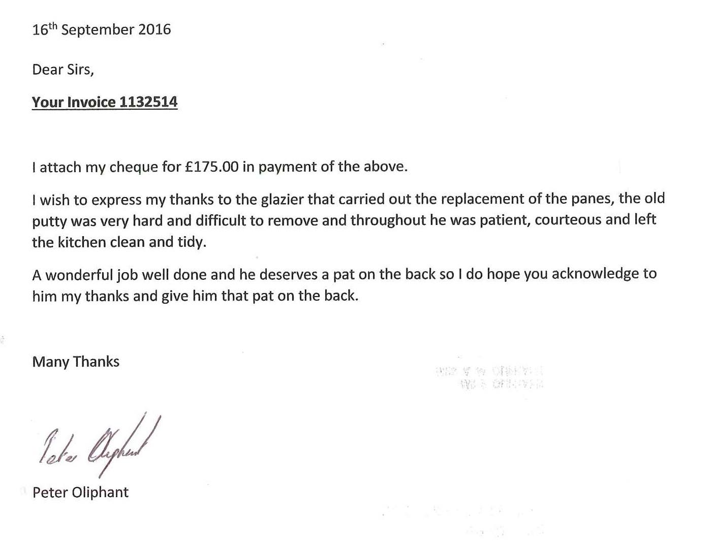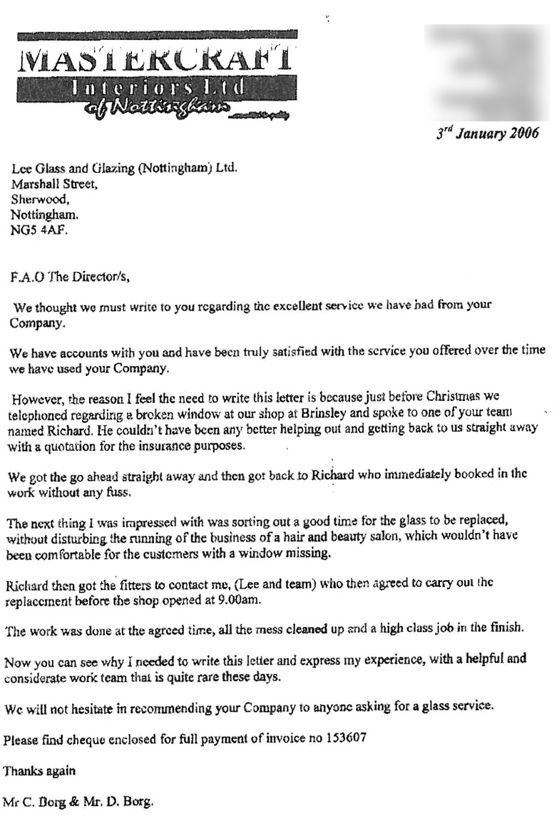We thought we must write to you regarding the excellent service we have had from your company. We have accounts with you and have been truly satisfied with the service you offered over the time we have used your company. However, the reason I feel the need to write this letter is because just before Christmas we telephoned regarding a broken window at our shop at Brinsley and spoke to one of your team named Richard.