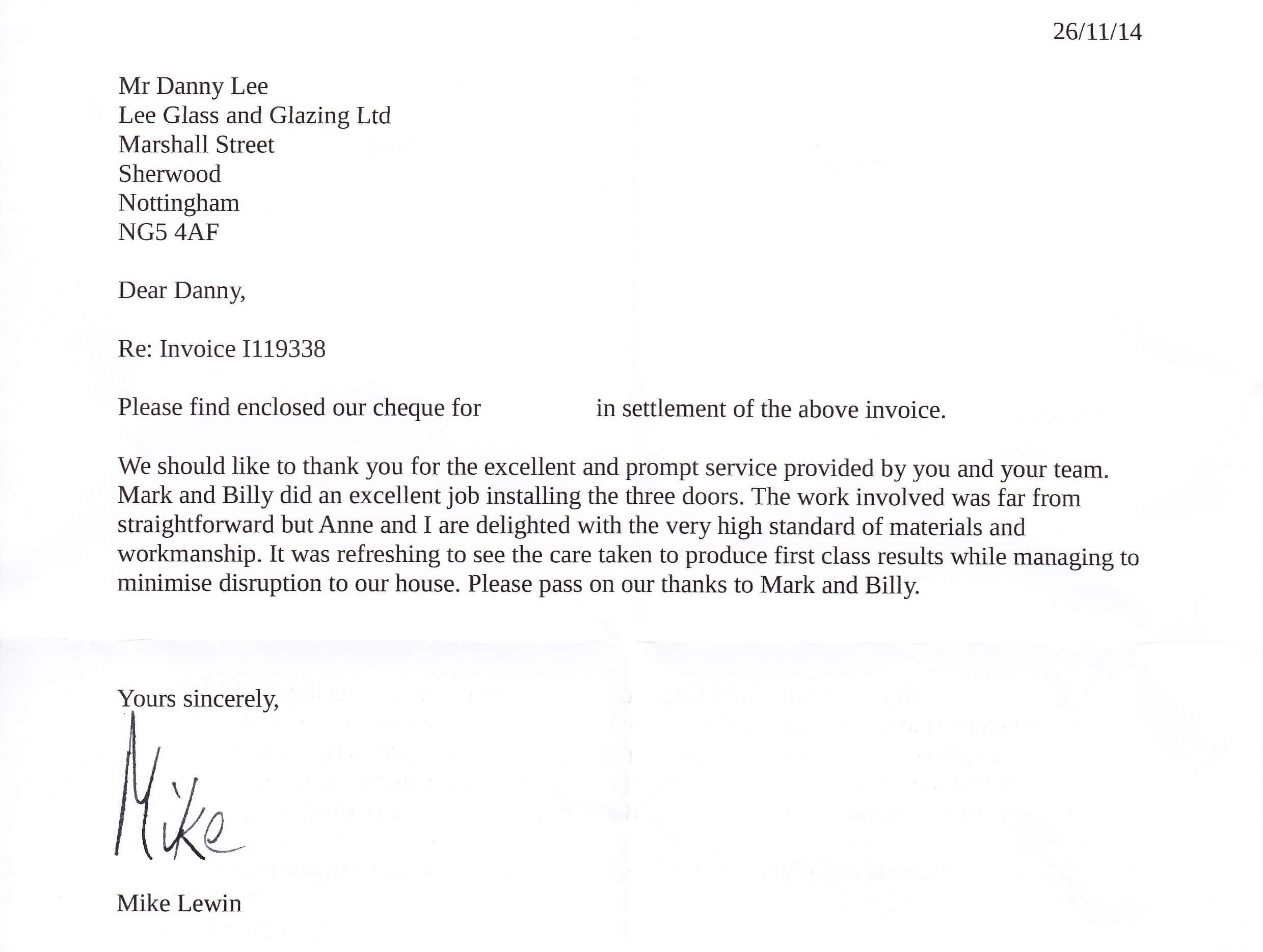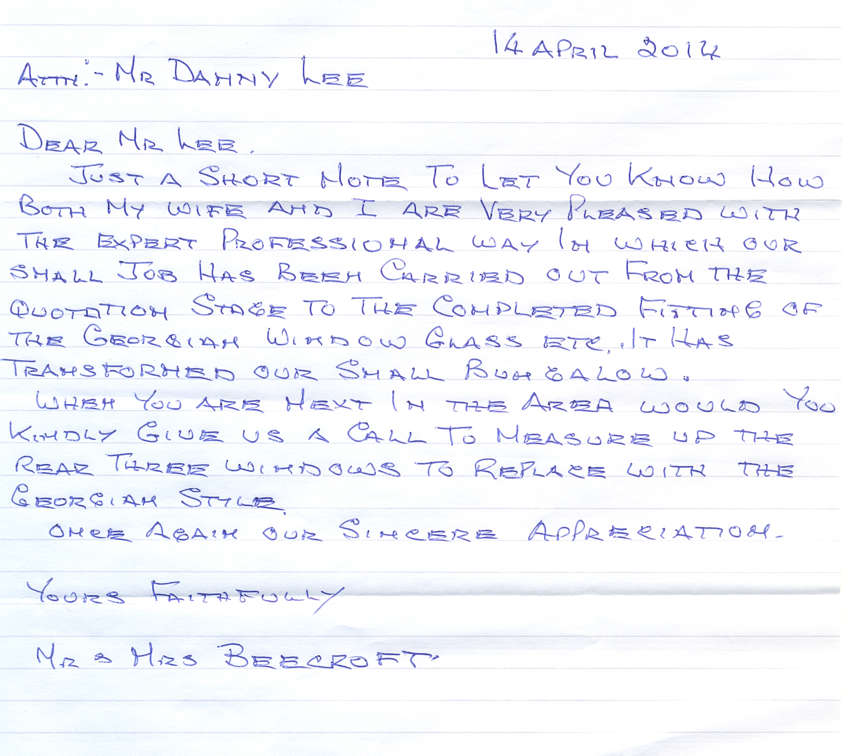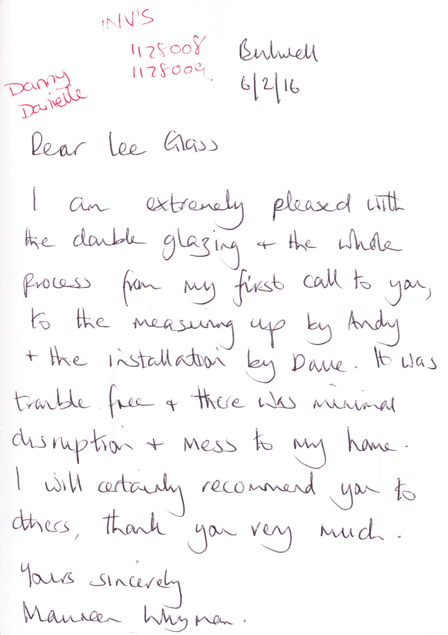 We thought we must write to you regarding the excellent service we have had from your company. We have accounts with you and have been truly satisfied with the service you offered over the time we have used your company. However, the reason I feel the need to write this letter is because just before Christmas we telephoned regarding a broken window at our shop at Brinsley and spoke to one of your team named Richard.