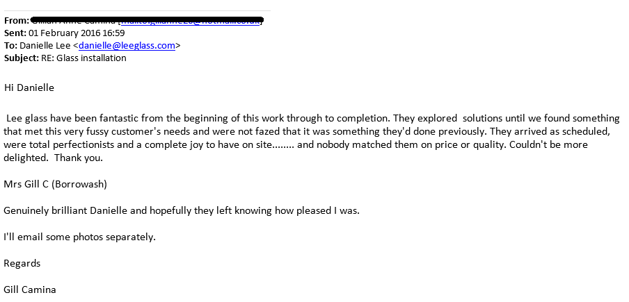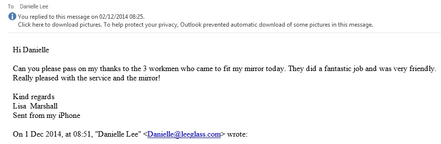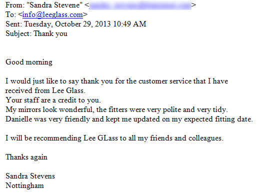 I would just like to say thank you for the customer service that I have received from Lee Glass. Your staff are a credit to you. My mirrors look wonderful, the fitters were very polite and very tidy. Danielle was very friendly and kept me updated on my expected fitting date. I will be recommending Lee Glass to all my friends and colleagues.