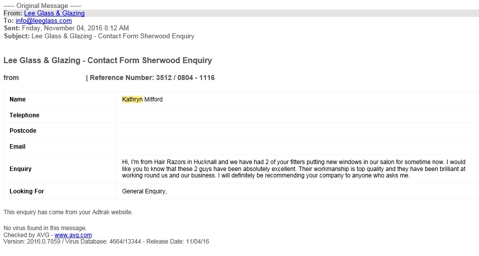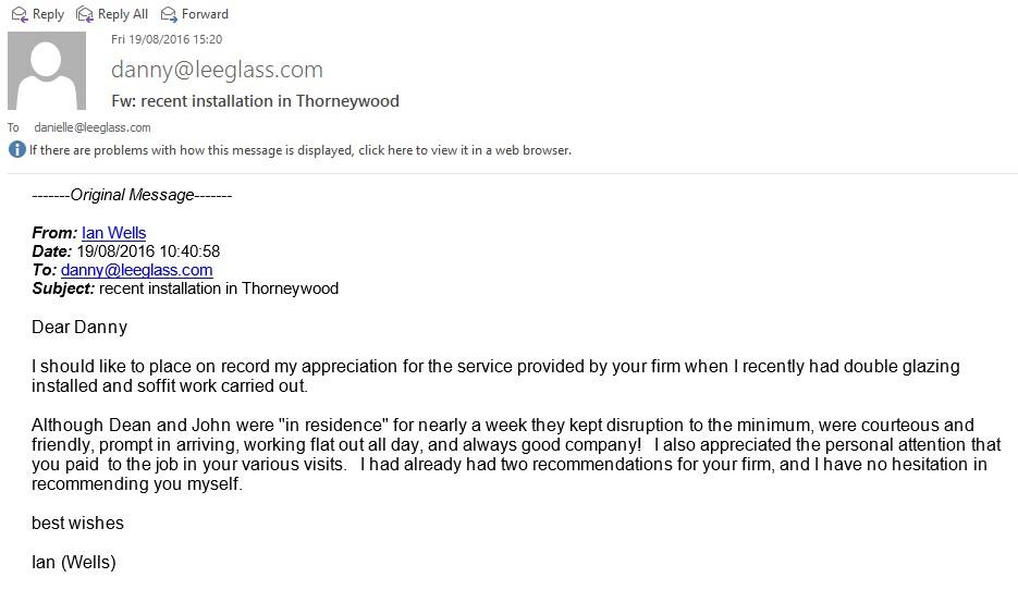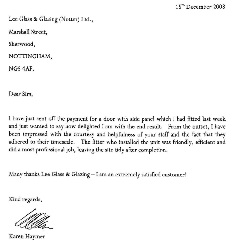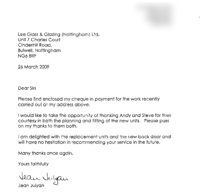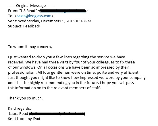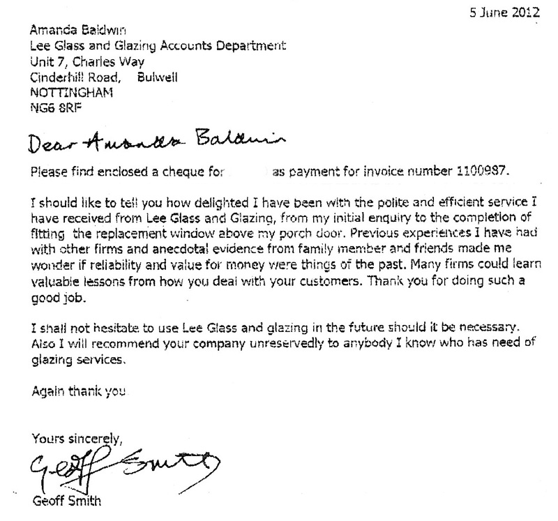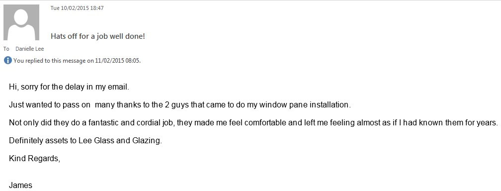 I should like to tell you how delighted I have been with the polite and efficient service I have received from Lee Glass and Glazing from my initial enquiry to the completion of fitting the replacement window above my porch door. Previous experiences I have had with other firms and anecdotal evidence from family member and friends made me wonder