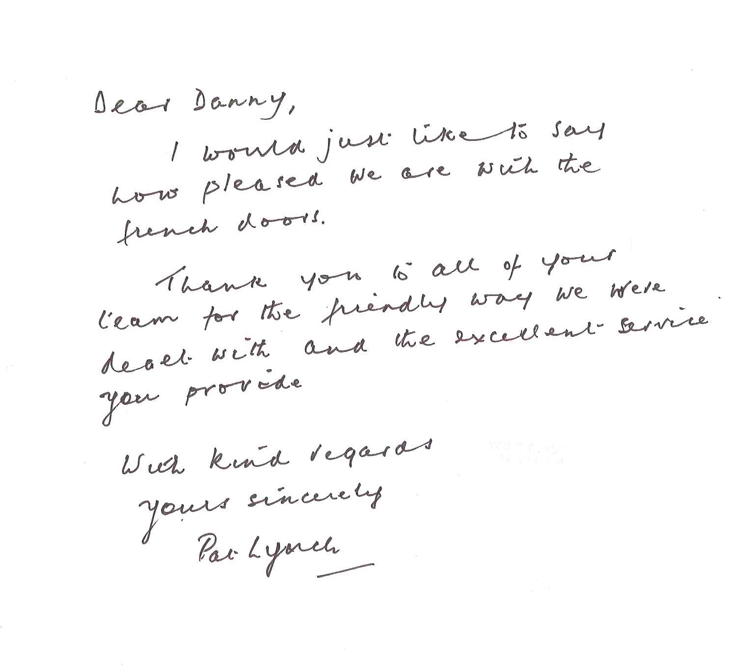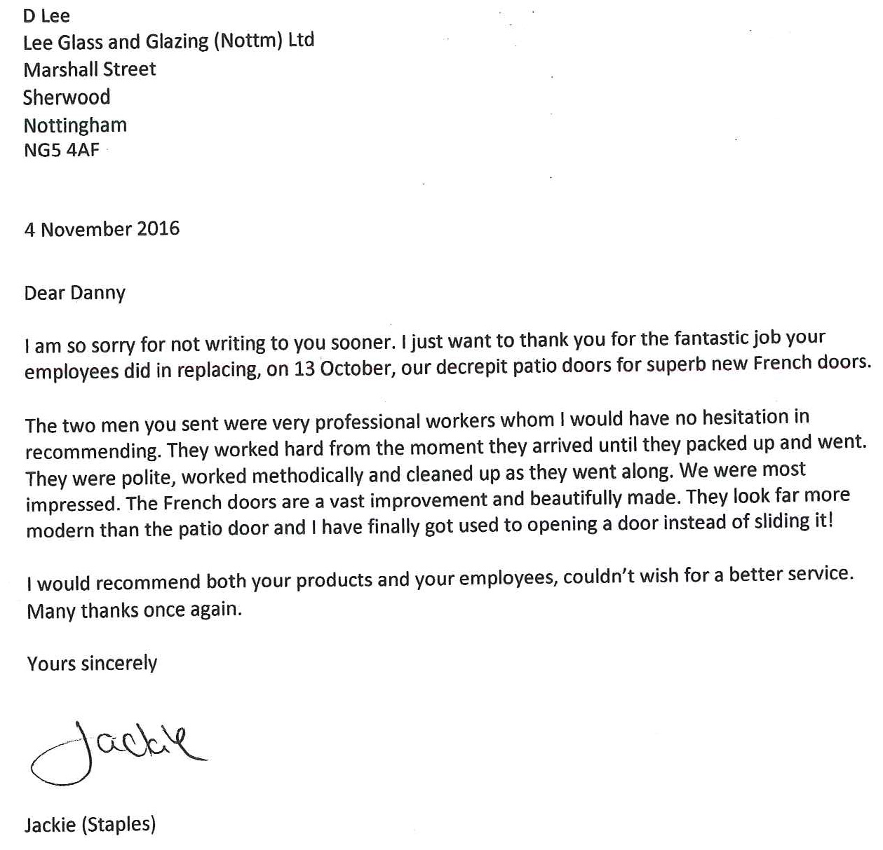 I am so sorry for not writing to you sooner. I just want to thank you for the fantastic job your employees did in replacing, on 13th October, our decrepit patio doors for superb new French doors.