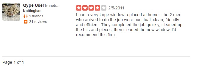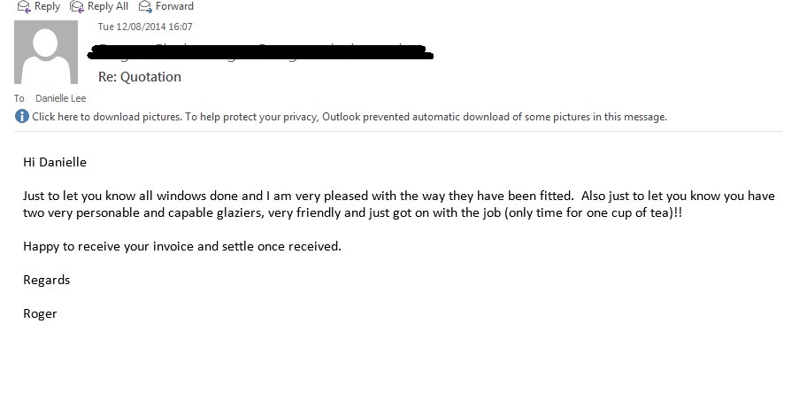 Just to let you know all windows done and I am pleased with the way they have been fitted. Also just to let you know you have two very personable and capable glaziers, very friendly and just got on with the job (only time for one cup of tea)!!