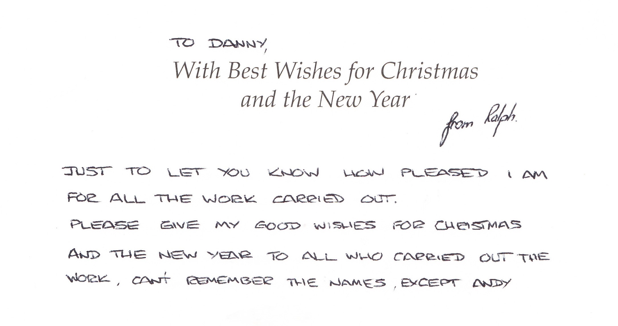 Just to let you know how pleased I am for all the work carried out. Please give my good wishes for Christmas and the New Year to all who carried out the work, can’t remember the names except Andy
