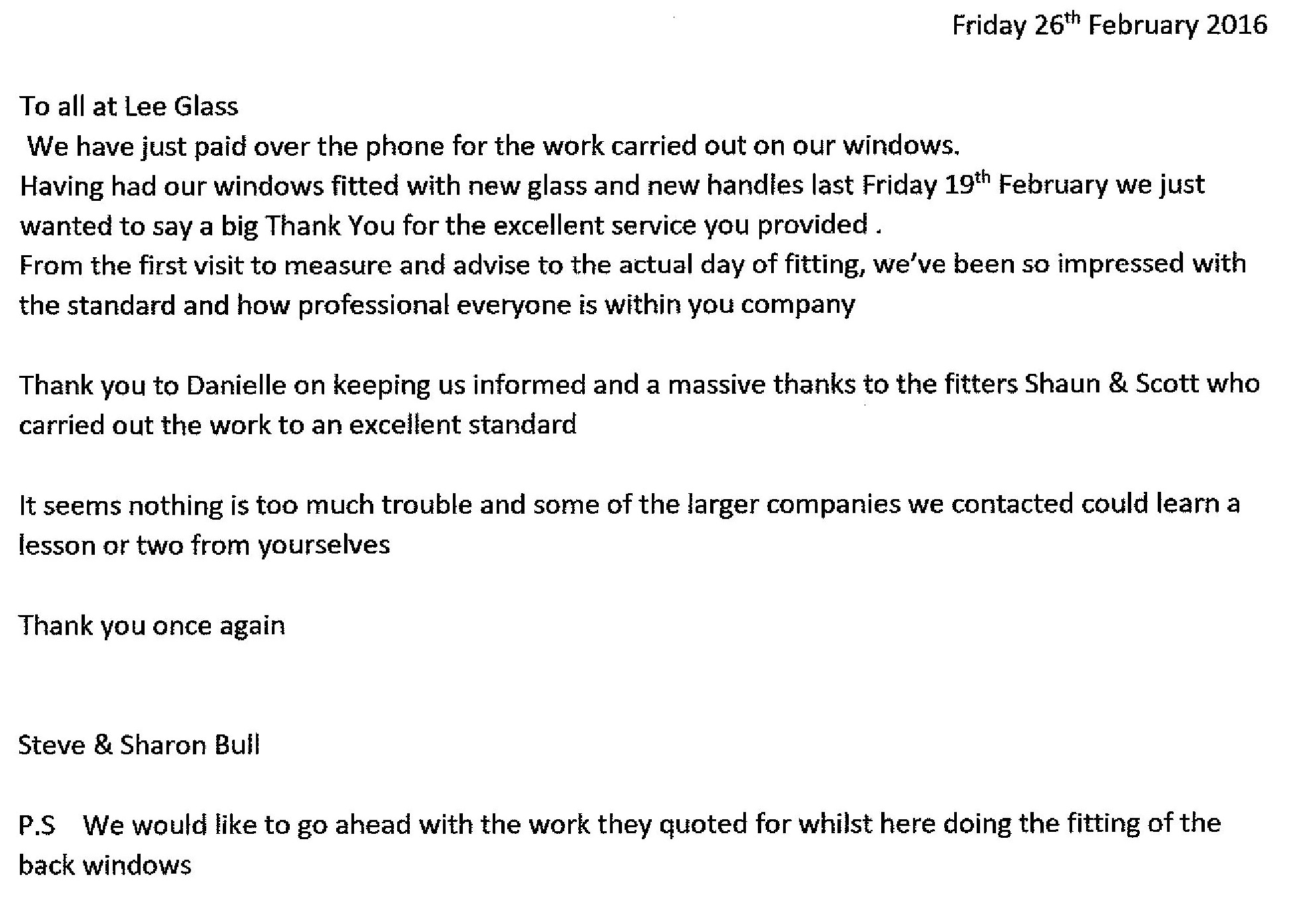We have just paid over the phone for the work carried out on our windows. Having had our windows fitted with new glass and new handles last Friday 19th February we just wanted to say a big thank you for the excellent service you provided.