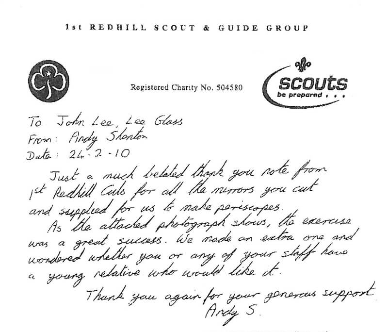 Just a much belated thank you note from 1st Redhill Cubs for all the mirrors you cut and supplied for us to make periscopes. As the attached photograph shows, the exercise was a great success. We made an extra one and wondered whether you or any of your staff have a young relative who would like it?