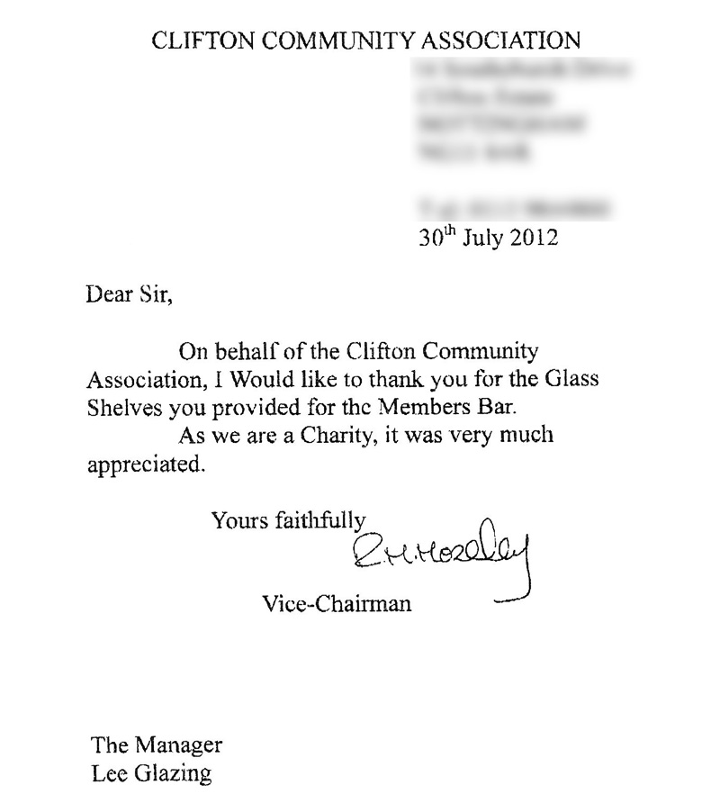 On behalf of the Clifton Community Assosciation, I would like to thank you for the glass shelves you provided for the members’ bar. As a charity, it was very much appreciated