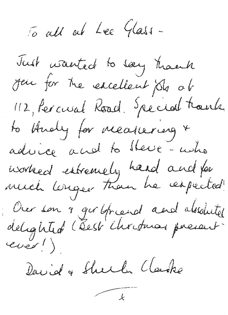 Lee glass have been fantastic from the beginning of this work through to completion. They explored  solutions until we found something that met this very fussy customer’s needs and were not fazed that it was something they’d not done previously. They arrived as scheduled, were total perfectionists and a complete joy to have on site…….. and nobody matched them on price or quality. Couldn’t be more delighted.
