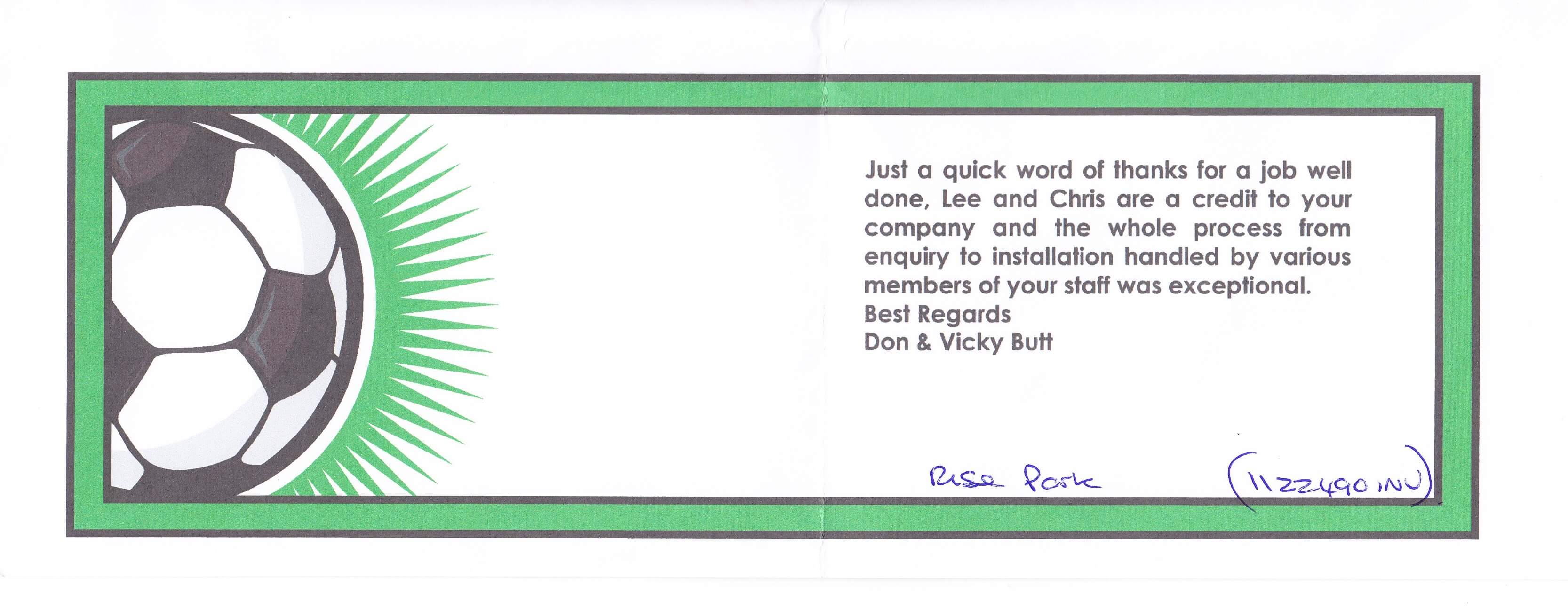 Just a quick word of thanks for job well done, Lee and Chris are a credit to your company and the whole process from enquiry to installation handles by various members of your staff was exceptional.