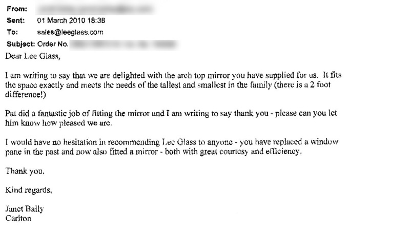 I am writing to say that we are delighted with the arch top mirror that you have supplied for us. It fits the space exactly and meets the needs of the tallest and smallest in the family. (There is a 2 foot difference!). Paul did a fantastic job of fitting the mirror and I am writing to say thank you – please can you let him know how pleased we are.
