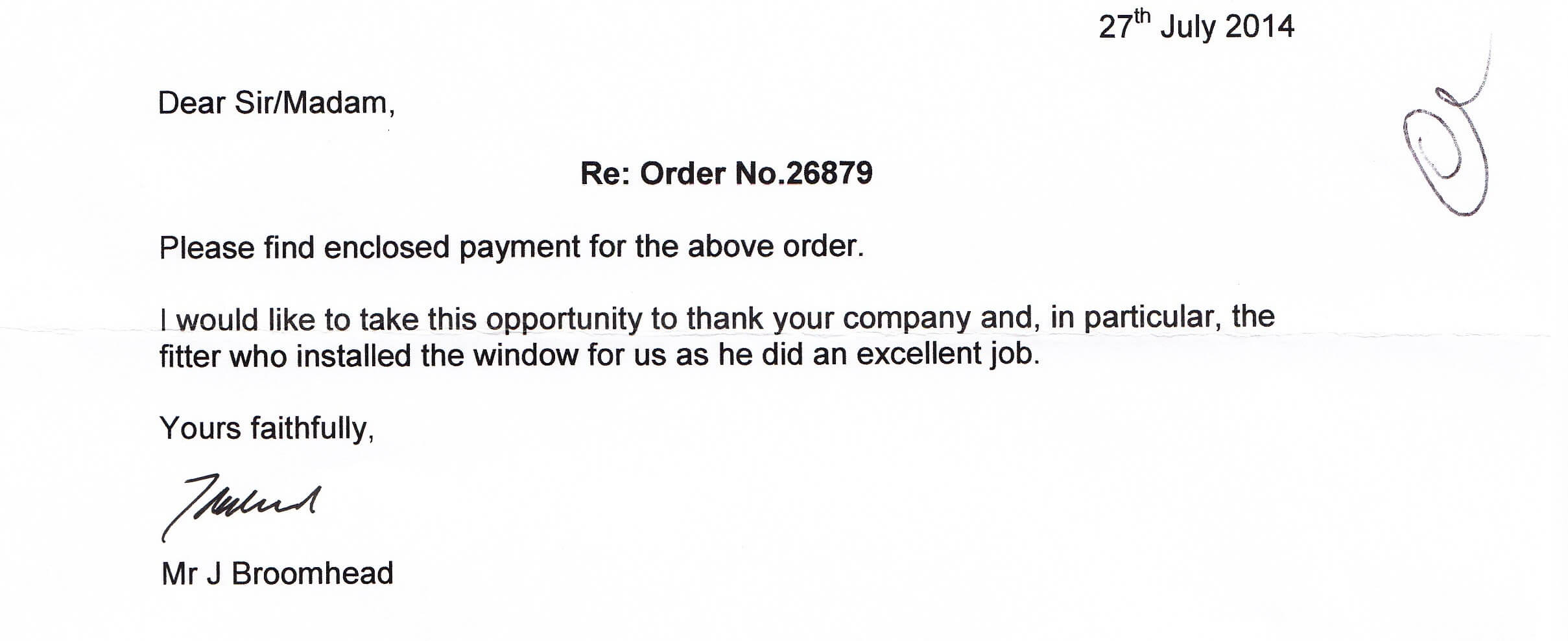 I would like to take this opportunity to thank your company and, in particular, the fitter who installed the window for us as he did an excellent job.