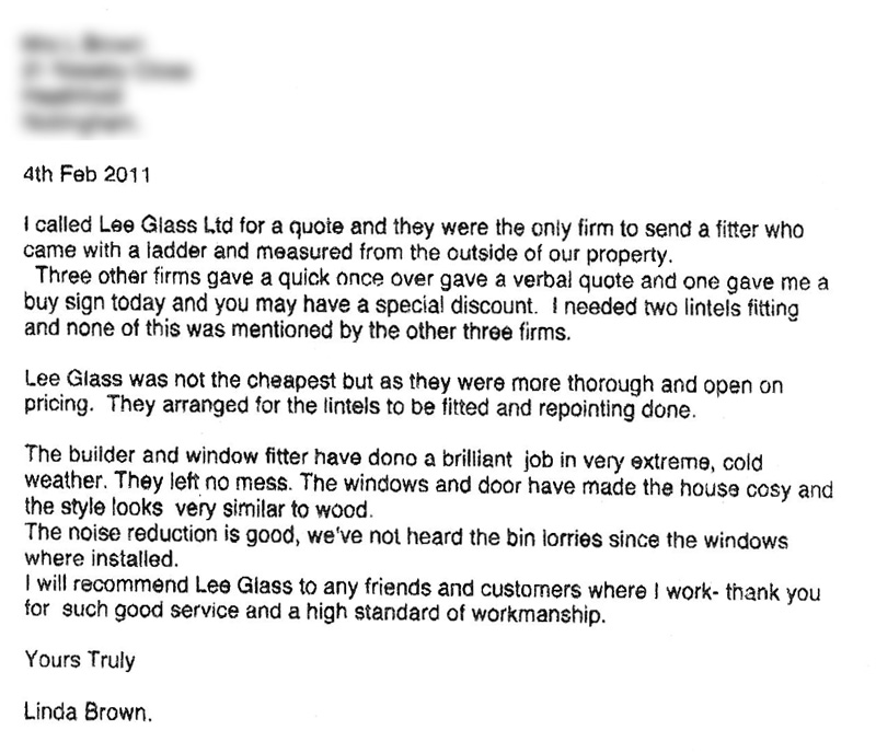 I called Lee Glass  Ltd for a quote and they were the only firm to send a fitter who came with a ladder and measured from the outside of our property. Three other firms gave a quick once over and gave a verbal quote and one gave me a buy sign today and you may have a special discount. I need two lintels fitting and none of this was mentioned by the other three firms.