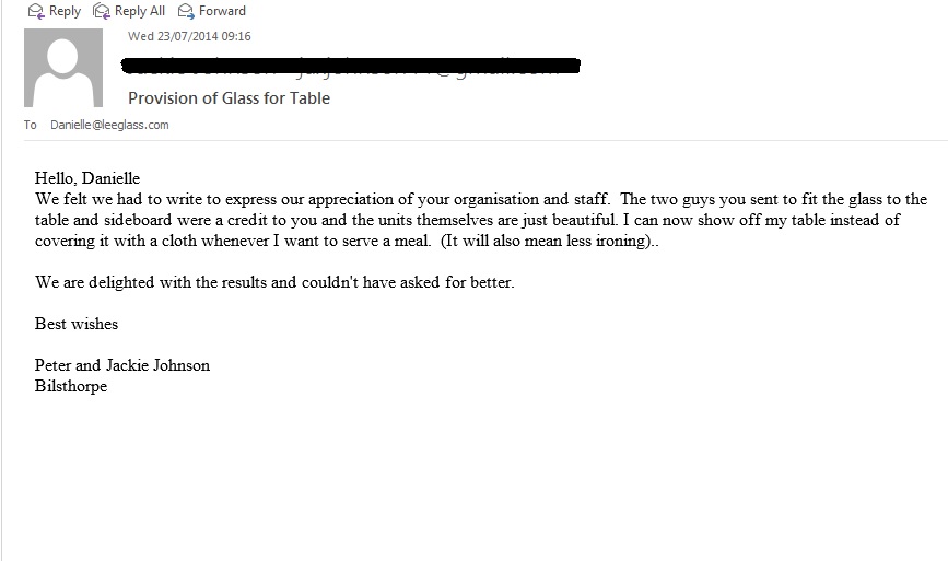 We felt we had to write to express our appreciation of your organisation and staff. The two guys you sent to fit the glass to the table and sideboard were a credit to you and the units themselves are just beautiful. I can now show off my table instead of covering it with a cloth whenever I want to serve a meal. (It will also mean less ironing)…We are delighted with the results and couldn’t have asked for better.